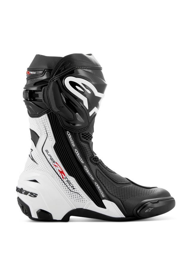 Almost every component of the Supertech R Vented Boot, Alpinestars definitive racing boot as worn by a roster of champions past and present, has undergone a rigorous program of upgrades to sharpen its performance features even further. Featuring extensive perforations throughout for maximum airflow, innovations derived using feedback from Alpinestars involvement in top flight racing include a newly redesigned front flex area, a redesigned rear bellow, a redesigned top gaitor, a new shifter and shin plate, a new shin slider and a new inner bootie, all of which enhance the comfort, protection and the performance of this boot to a new class-leading high.
