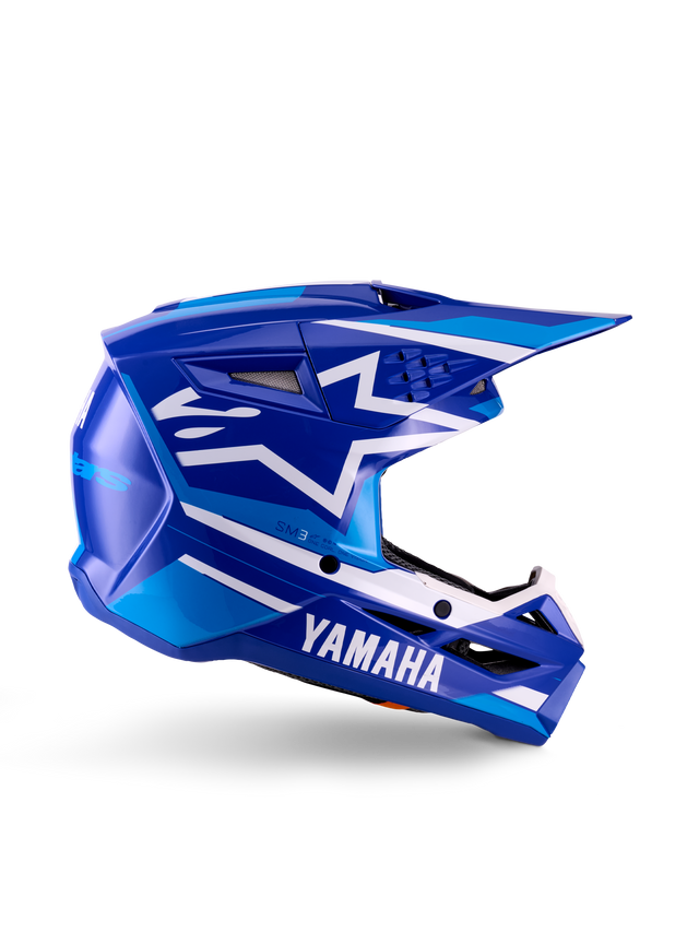 Alpinestars Yamaha S-M3 Youth Helm ECE06, Motocross-Helm für Jugendliche, Blau und Weiß, Glänzendes Finish, Langer Visier, Geometrisches Design mit Sternelement, Belüftungsöffnungen, YAMAHA-Branding